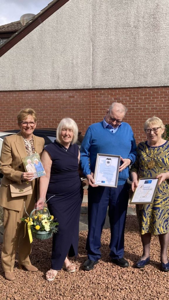 And joining them at their home in Larkhall to help them celebrate their Diamond Wedding Anniversary was South Lanarkshire Provost Margaret Cooper, who presented the couple with flowers and a certificate on behalf of the council.