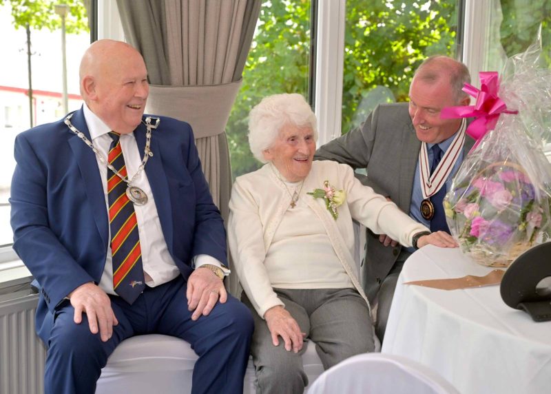 The  Depute Provost presented Peggy  with a basket of flowers and card  from North  Lanarkshire Council  whilst Deputy Lieutenant ,  Alistair Peat  passed on   a certificate  and congratulations  from  the Lord Lieutenant of Lanarkshire,  Lady Haughey CBE  .