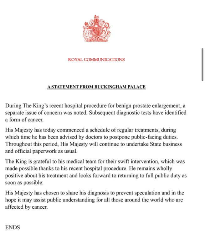 Following the above statement, issued on 5th February 2024, everyone at the Lanarkshire Lieutenancy wishes King Charles a full and speedy recovery and our thoughts are with the King and all members of the Royal Family at this time .